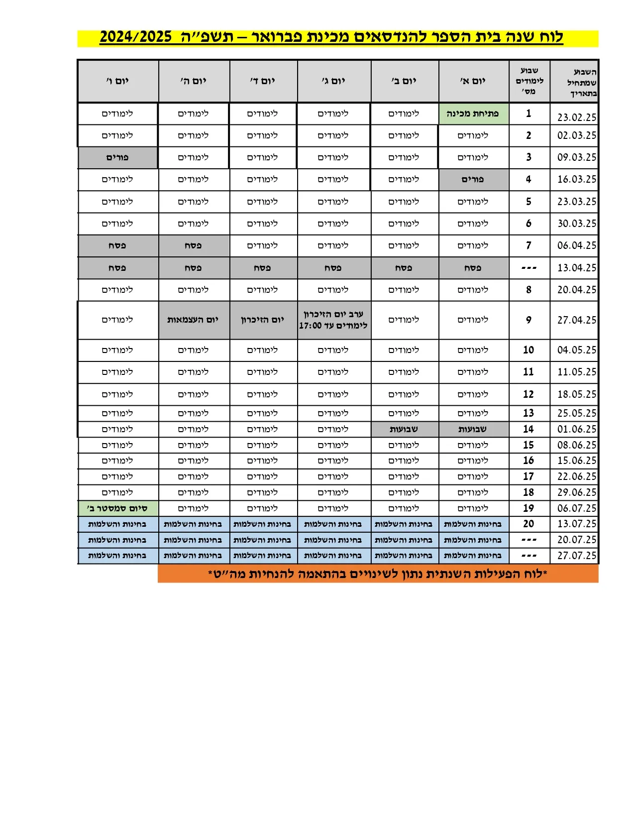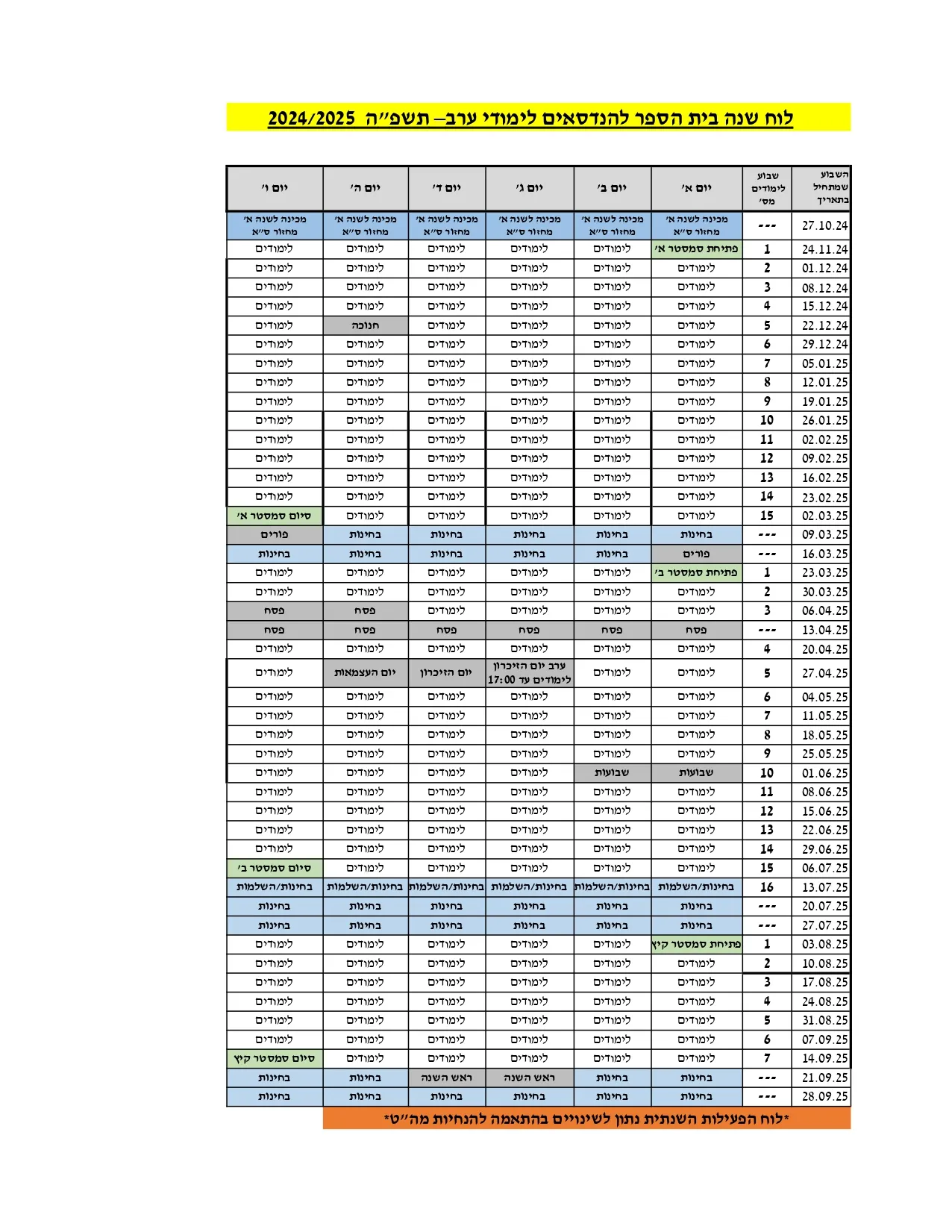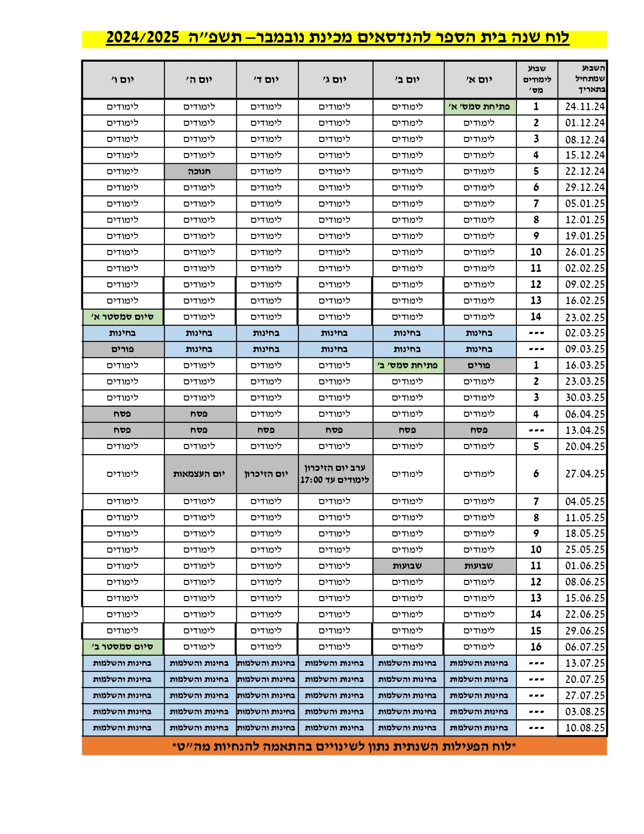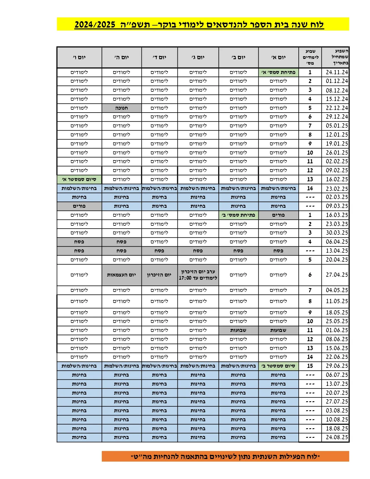 כאן תוכלו למצוא את כל התאריכים החשובים לשנת הלימודים תשפ"ה, כולל מועדי פתיחת וסיום סמסטרים, ימי פעילות מיוחדים, סדנאות, ימי עיון, חופשות, מועדי מבחנים ועוד.